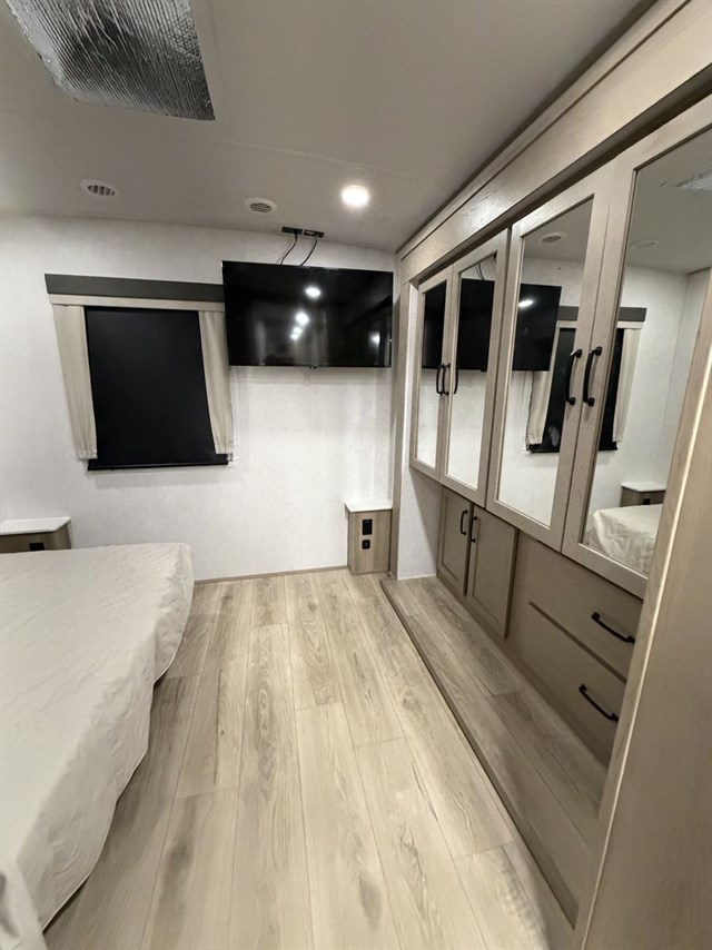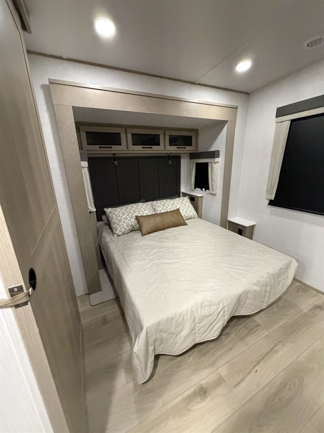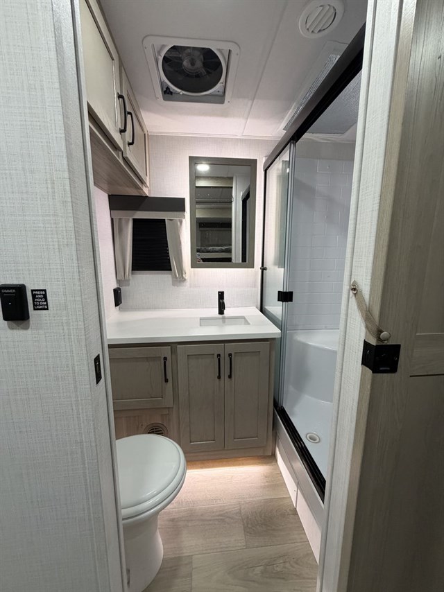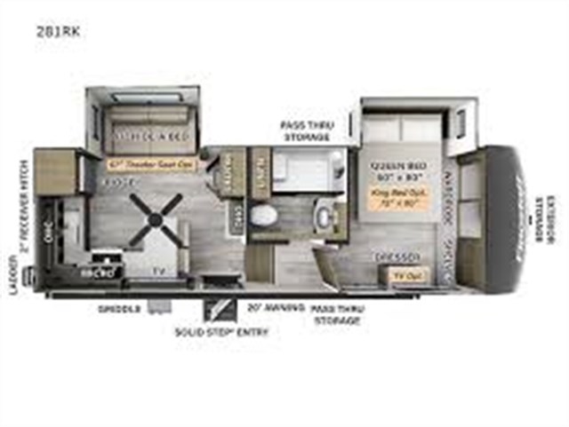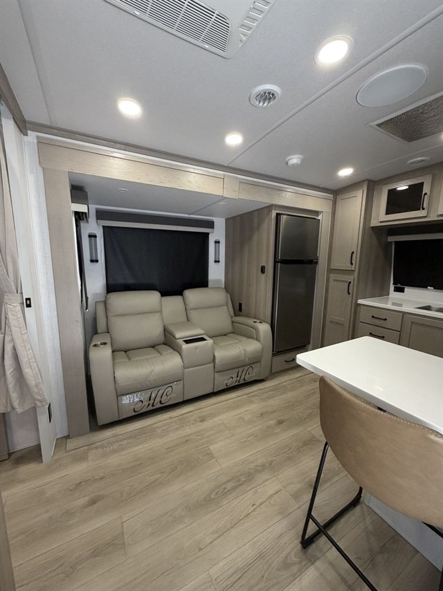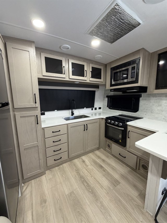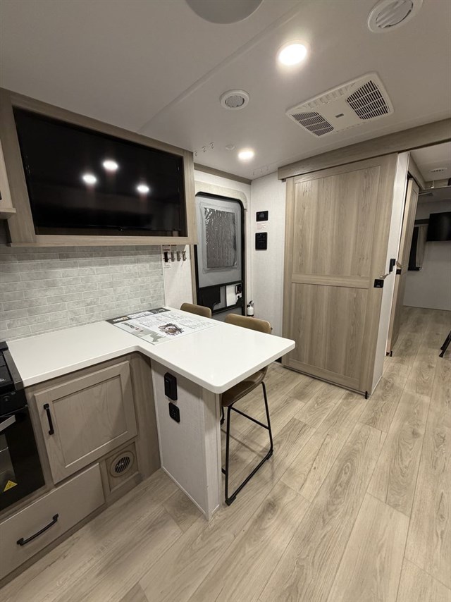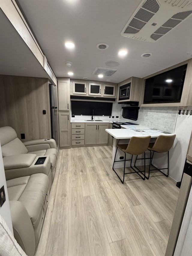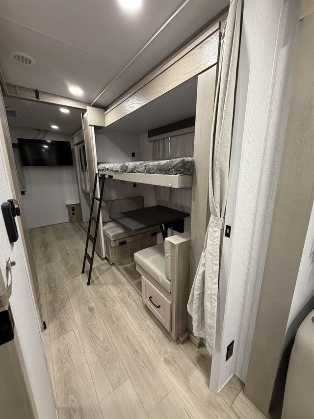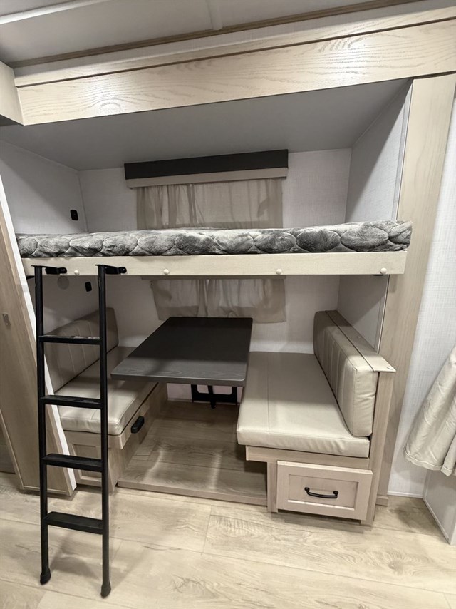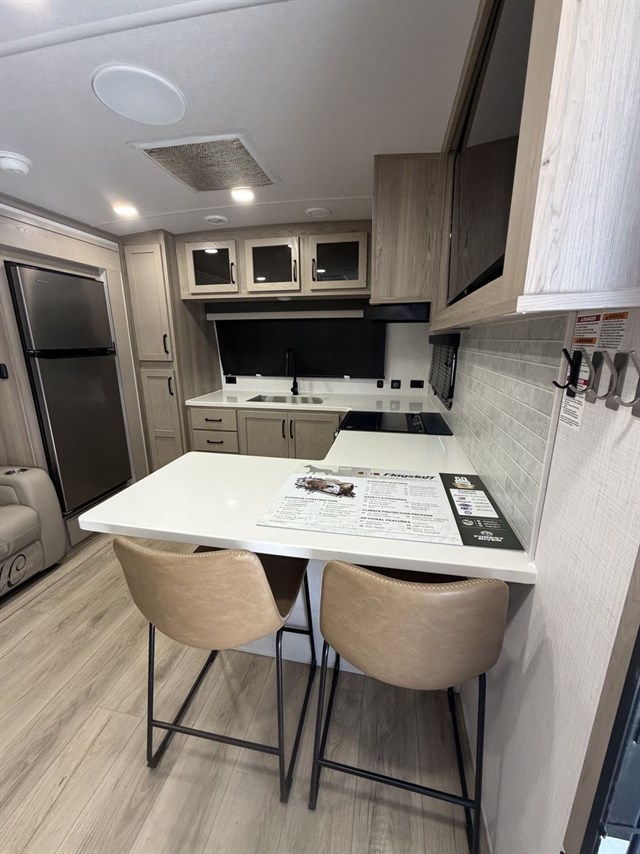 This travel trailer can be used as a couple's coach or a family getaway! The rear private bedroom has a queen bed slide to lay your head on at night with an optional TV to watch movies in bed, plus a wardrobe/linen closet slide to store your clothes. Within that same slide you will find a 72" x 30" flip-up bunk bed above a 32" dinette which can be transformed into a second bed. Everyone can freshen up in the full bathroom which includes a shower with a seat, toilet and vanity with sink. The front kitchen offers a u-shaped counter and full amenities to whip up meals and snacks while you camp. You could even use the outdoor griddle to enjoy breakfast outside under the 21' awning at sunrise!