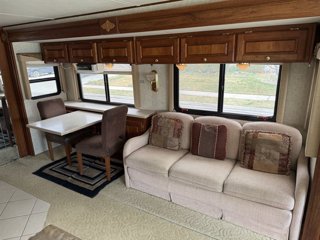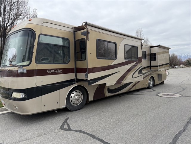 The 2003 Monaco Windsor 40PDQ is a high-quality, 40-foot Class A diesel pusher, often built on a Roadmaster chassis with an 8-airbag suspension. Featuring four slide-outs, it offers a spacious, luxurious layout with premium features such as wood cabinetry, a 370hp Cummins engine and hydraulic leveling.