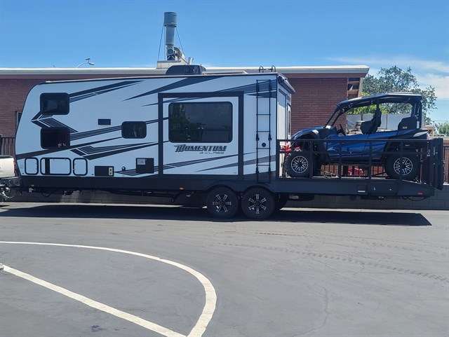 This unique design will turn heads everywhere you travel. Eleven foot eternal garage keeps fuel and dirt out of your living space and doubles as a patio with outdoor kitchen. Pictured with 2021, 1000cc R-max (sold separately $18k).