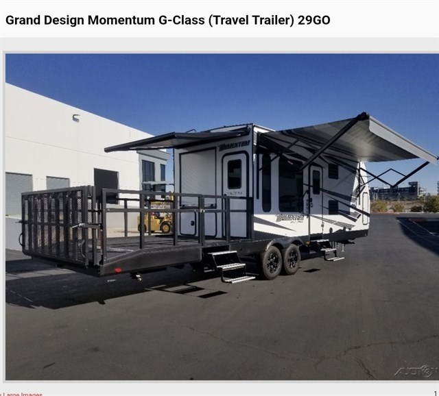The 2020 Grand Design Momentum G-Class 29G is a ~34-foot travel trailer toy hauler featuring an 13-foot garage, slide, and a 12,000 lbs GVWR. Designed for versatile cargo/living space, it offers a 1,500 lbs hitch weight, 3,600+ lbs cargo capacity, and 100 gallons of fresh water, making it well-suited for extended off-grid adventures and a masterful blend of luxury and functionality, perfect for those who crave adventure without sacrificing comfort. This toy hauler boasts a spacious 33.92-foot length, providing ample room for both living and storage. The versatile floorplan features a center kitchen and living area, ensuring that meal prep and relaxation are conveniently at your fingertips. With an 18-foot powered retractable awning, you can enjoy the great outdoors in style and shade. The queen bed in the front bedroom offers a cozy retreat, while additional sleeping arrangements include a full-size bed and a convertible option, comfortably accommodating up to six guests. The Momentum 29G is designed with practicality in mind, featuring two slides that enhance the living space, and a mid-size refrigerator that runs on both electric and propane for ultimate convenience. The garage has a Happi-Jac rollover sofas and a table provides a flexible area for toys or additional lounging. With a robust fresh water capacity of 100 gallons and grey and black water tanks each holding 57 gallons, your off-grid adventures are supported with ease. Whether you're hitting the road for a weekend getaway or a cross-country expedition, this RV ensures a seamless and enjoyable journey.